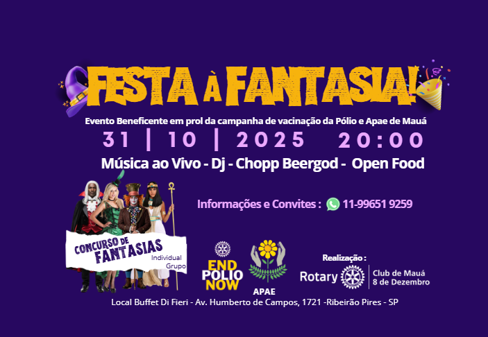 O Rotary Club de Mauá 8 de Dezembro convida você e sua família para a Festa à Fantasia Beneficente, em prol da APAE de Mauá e da Campanha de Vacinação contra a Poliomielite. Será uma noite inesquecível, repleta de diversão, música, surpresas e, principalmente, muito amor ao próximo.