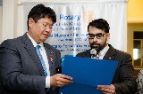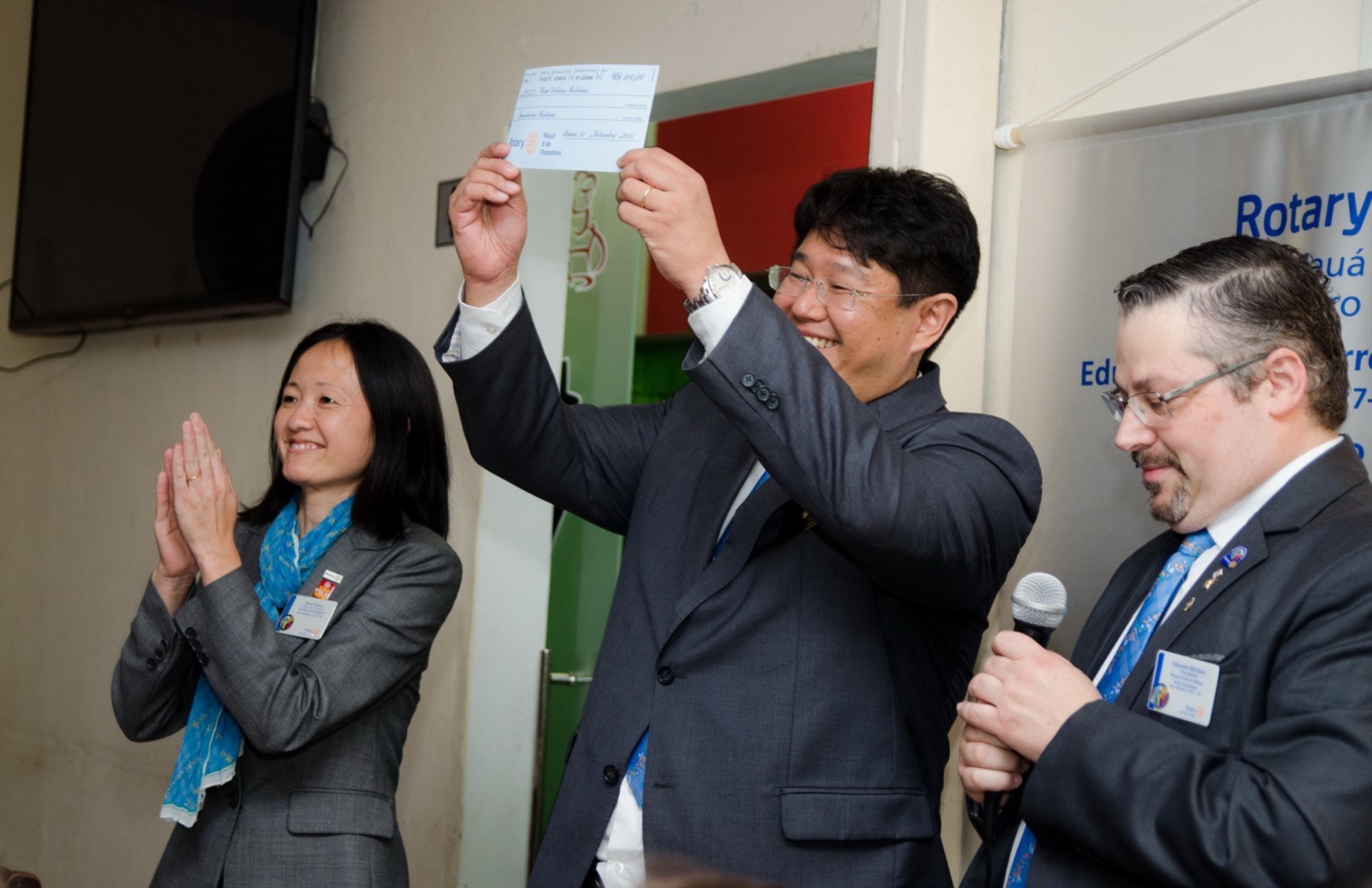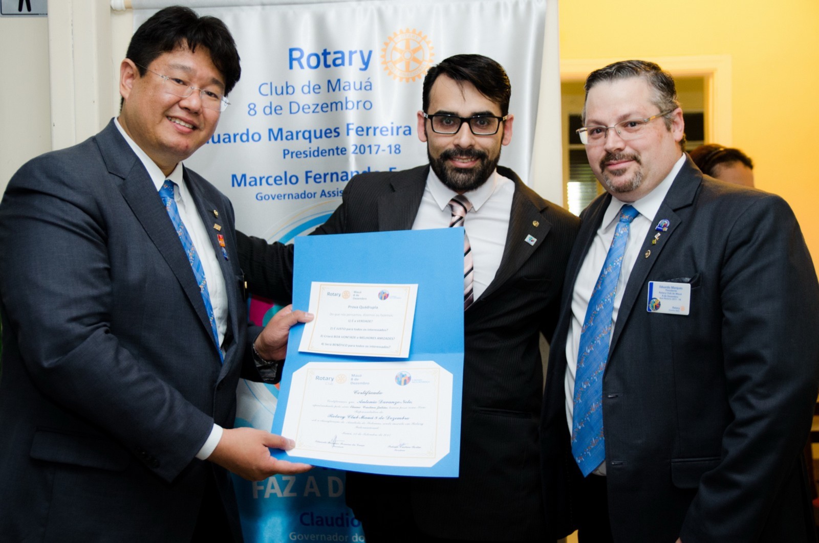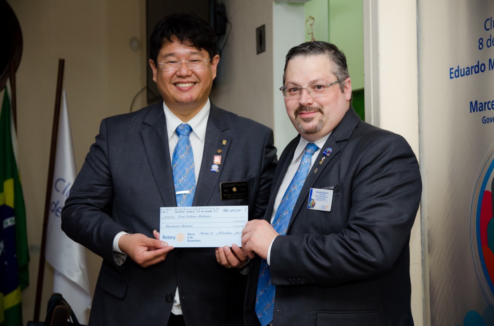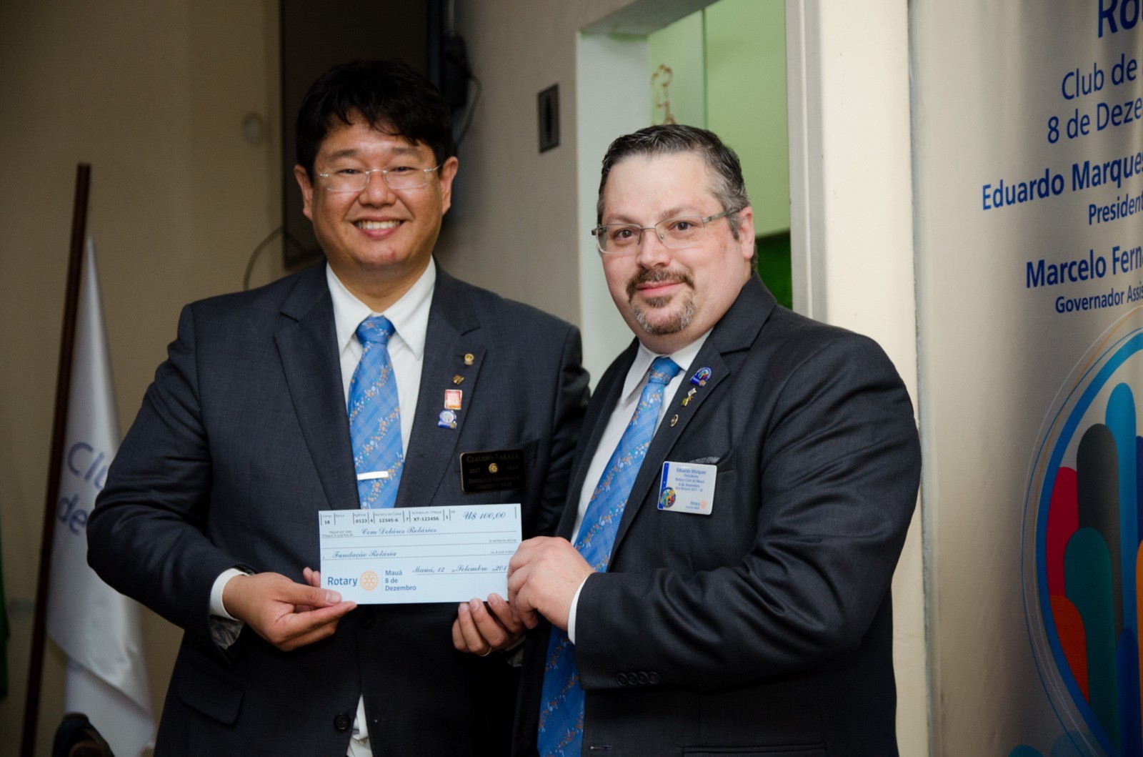 Durante a cerimônia, o presidente empossou um novo companheiro: Antônio Davanzo Neto. Em nome de todos os associados, Eduardo fez a doação de um cheque no valor de US$100 ao govenador destinado à Fundação Rotária.