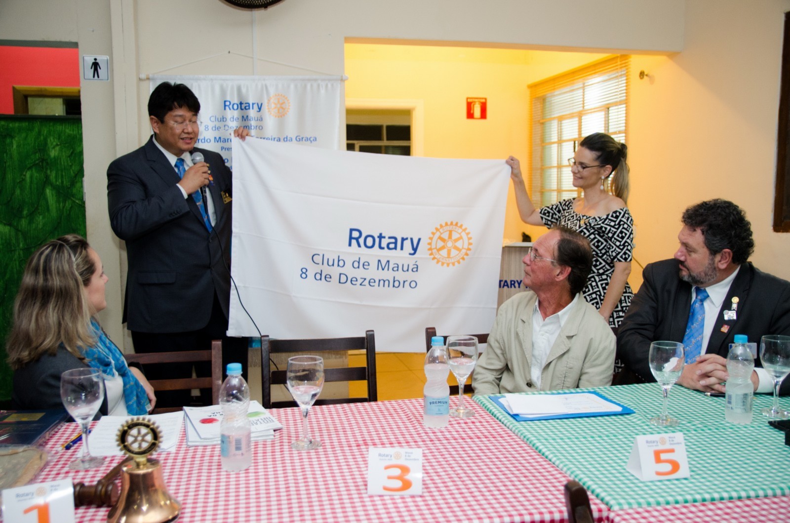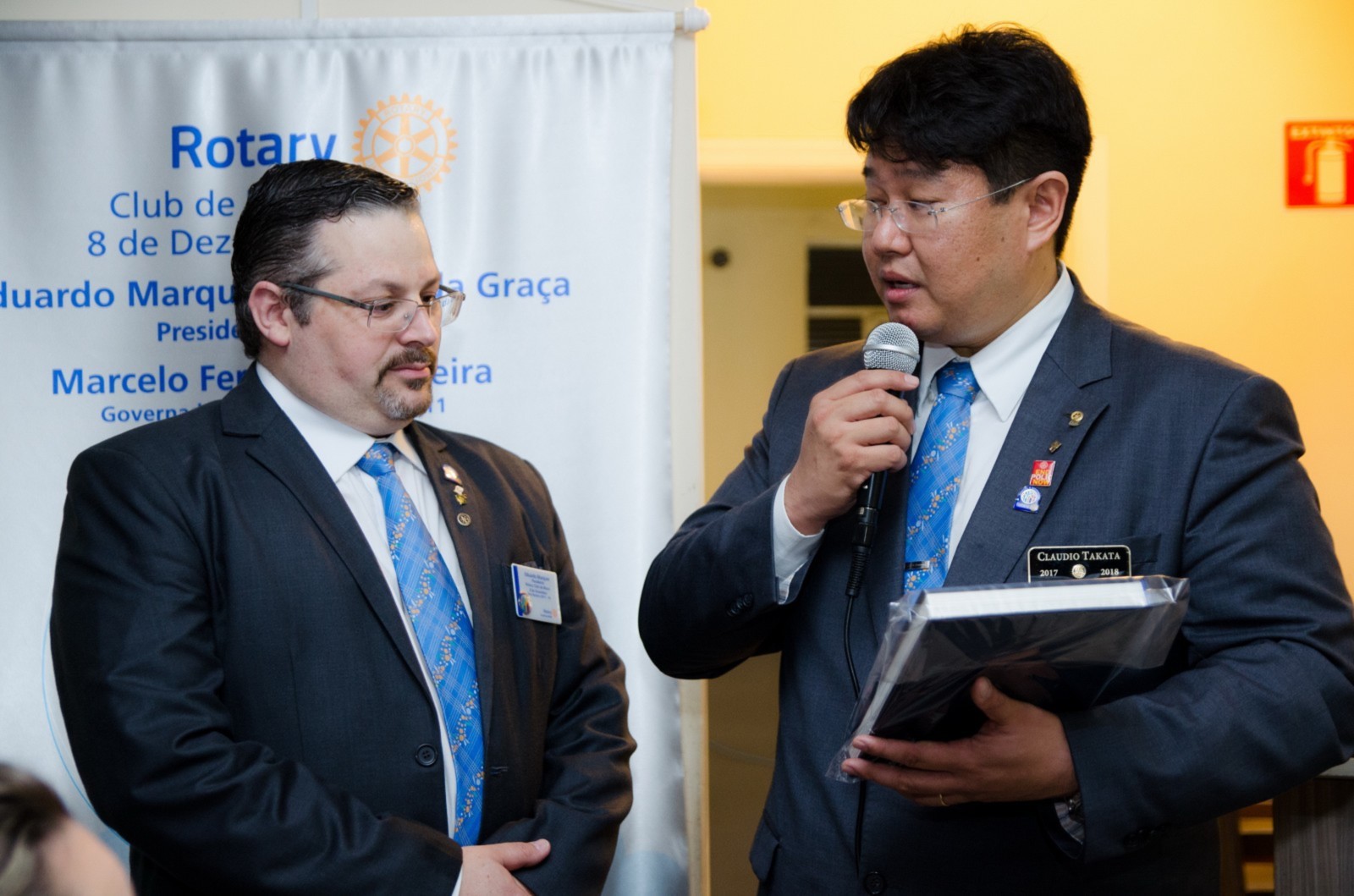Em seu discurso, Claudio reforçou sobre a continuidade dos trabalhos do Rotary International citando alguns valores sobre companheirismo, comprometimento, integridade, diversidade e liderança. Estou muito satisfeito com a visita, admirado pelo clube que, após um ano de sua fundação, mostra-se entusiasmado, comprometido e bastante engajado em propor novos projetos que atendam as necessidades da comunidade. O governador deu de presente ao presidente um livro que conta a história dos 100 anos da Fundação Rotária junto à bandeira com os novos padrões do nome do clube. Agradeceu a maravilhosa recepção de todos.