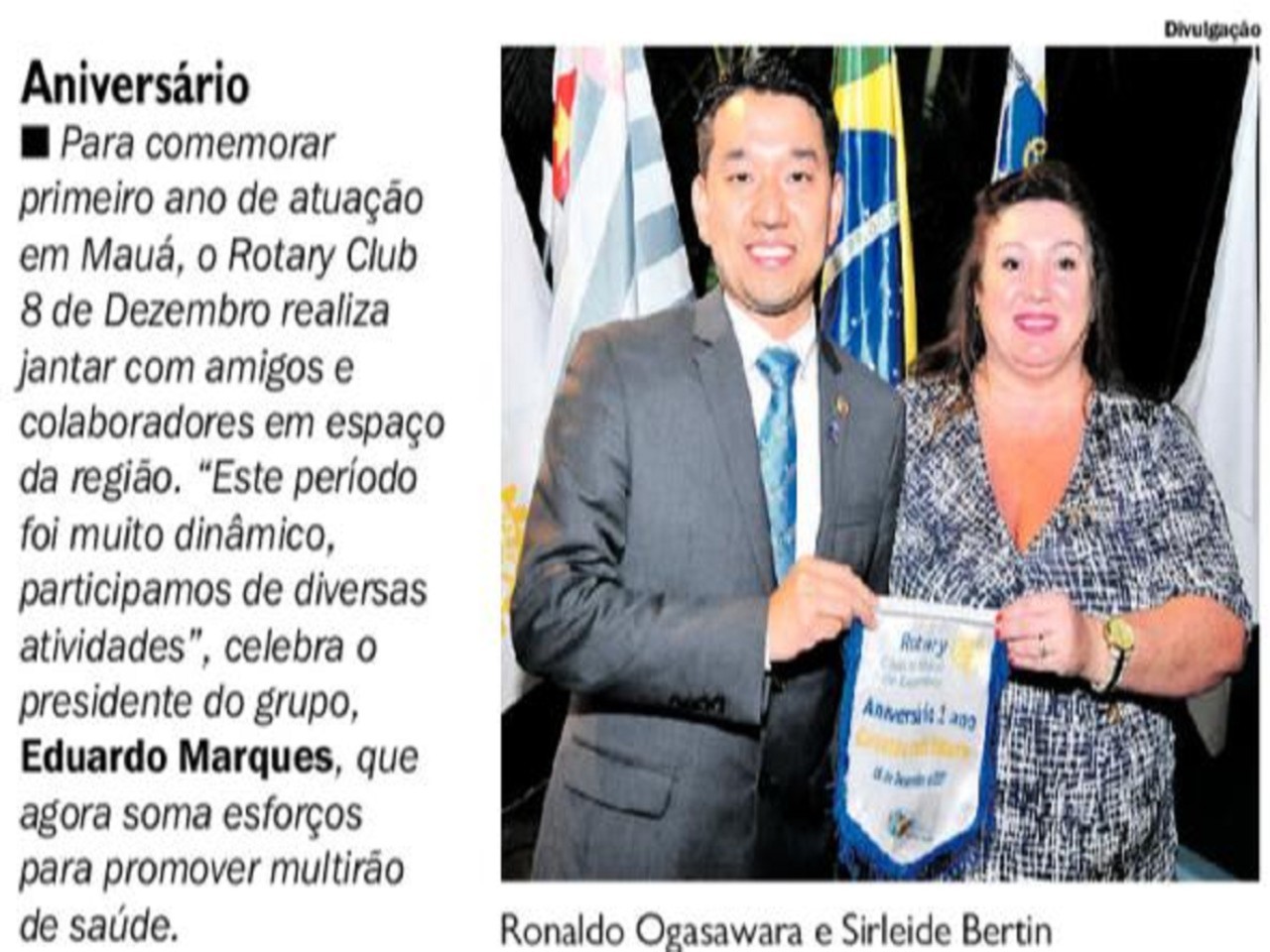 O Aniversário do R.C. Mauá 8 de Dezembro foi destaque no Jornal Diário do Grande Abc de 08/01/2018. O jantar de aniversário foi realizado em 15/12/2017, e na oportunidade o presidente Eduardo Marques falou sobre os projetos futuros do Clube.